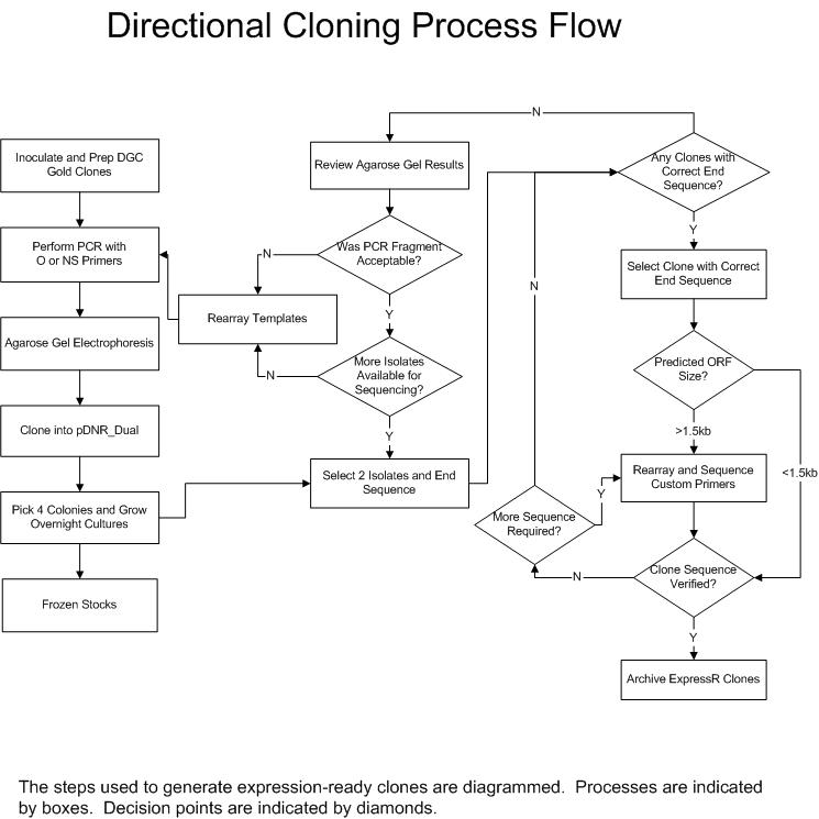 The BDGP is in the process of transferring over 7,000 high-quality ORFs into a universal donor vector. The ORFs originate from clones in our Gold Collection which serves as the primary resource for high-throughput proteomics applications. This is being accomplished with the use of the Clontech In-Fusion PCR cloning system (view Cloning Protocol) and the donor vector pDNR-Dual. In order to make the universal donor clone collection as useful as possible, two forms of each ORF are being made- one containing the native stop codon and one that lacks the stop codon and are referred to as the ExpressR-NativeStop(NS) and ExpressR-Open(O) clone collections, respectively. For expression, transfer of ORFs is mediated by in-vitro Cre-lox recombination to appropriate expression vectors (see below). The NS and O forms of the clones will allow for amino-terminal or carboxy-terminal fusion proteins, respectively. Diagrams of the directional cloning process flow and the bioinformatics process illustrate the subcloning process and the database steps and software used to track our progress and evaluate quality.